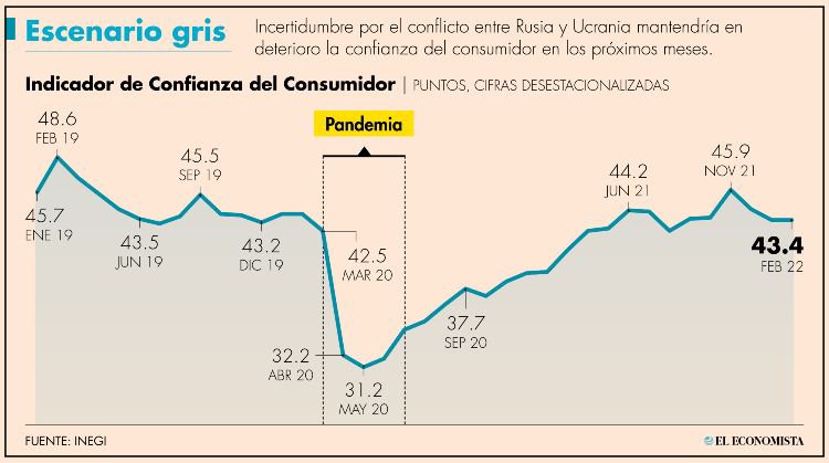 El Indicador de Confianza del Consumidor (ICC), que el Inegi elabora de manera conjunta con el Banco de México (Banxico), registró en el mes del amor y la amistad un nivel de 43.4 puntos, lo que significó un incremento de apenas 0.1 puntos frente a enero.